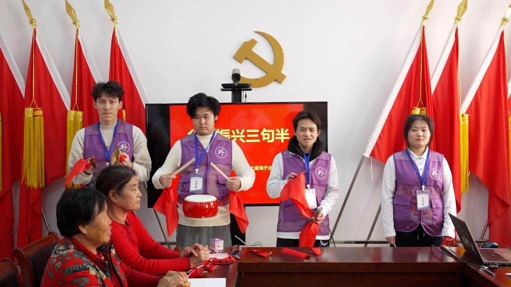 在“红色故事会”中,老党员用乡音讲述这片土地的奋斗史诗,青年党员以多语种诵读红色经典,老与少的对话恰似“丹砂红”——那份永不褪色的精神印记在传承中绵延。故事会后,“红色文化汇演”将活动推向高潮。同学们自编自演的乡村振兴主题三句半道出时代心声,一曲《我的祖国》在田野间深情回响。